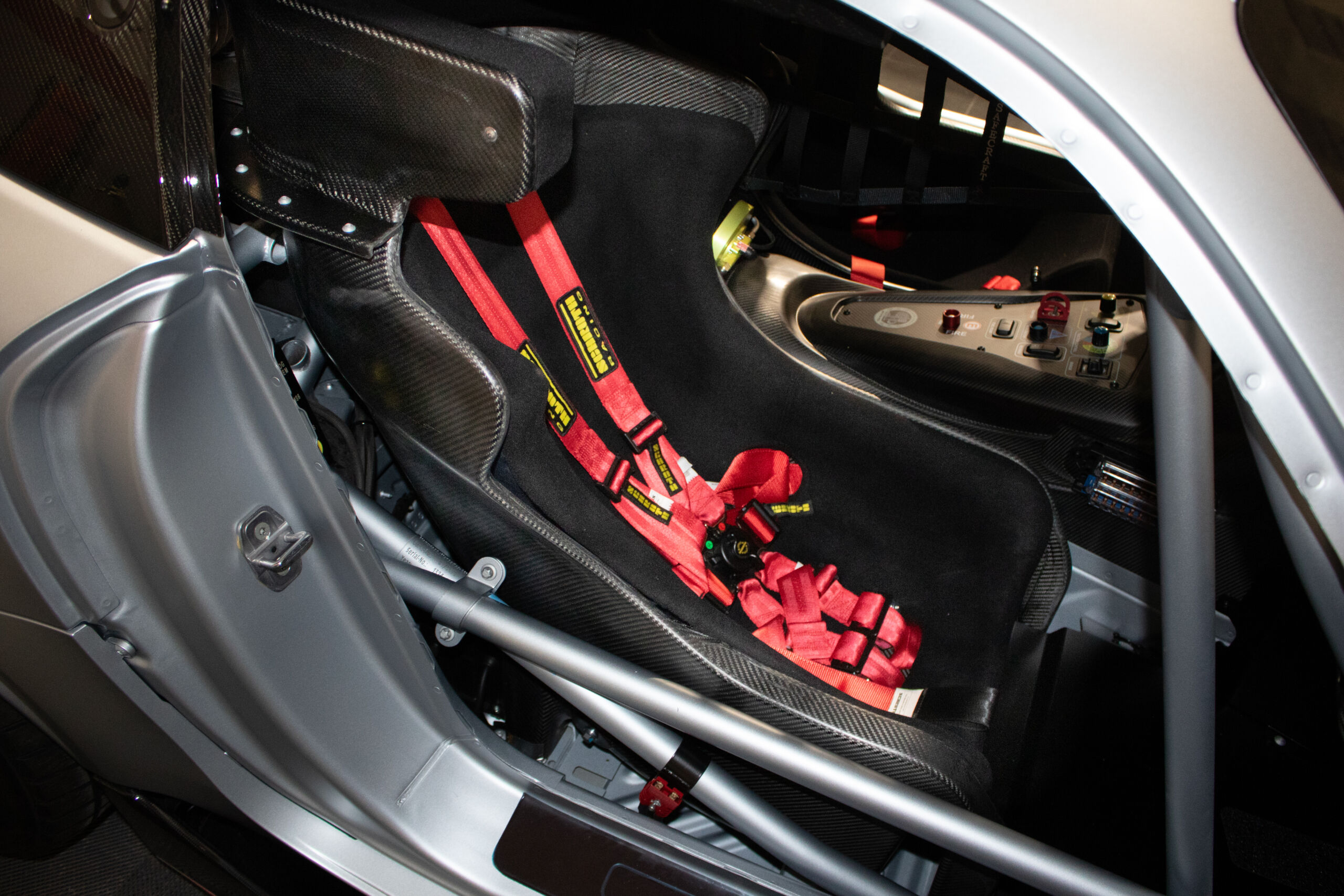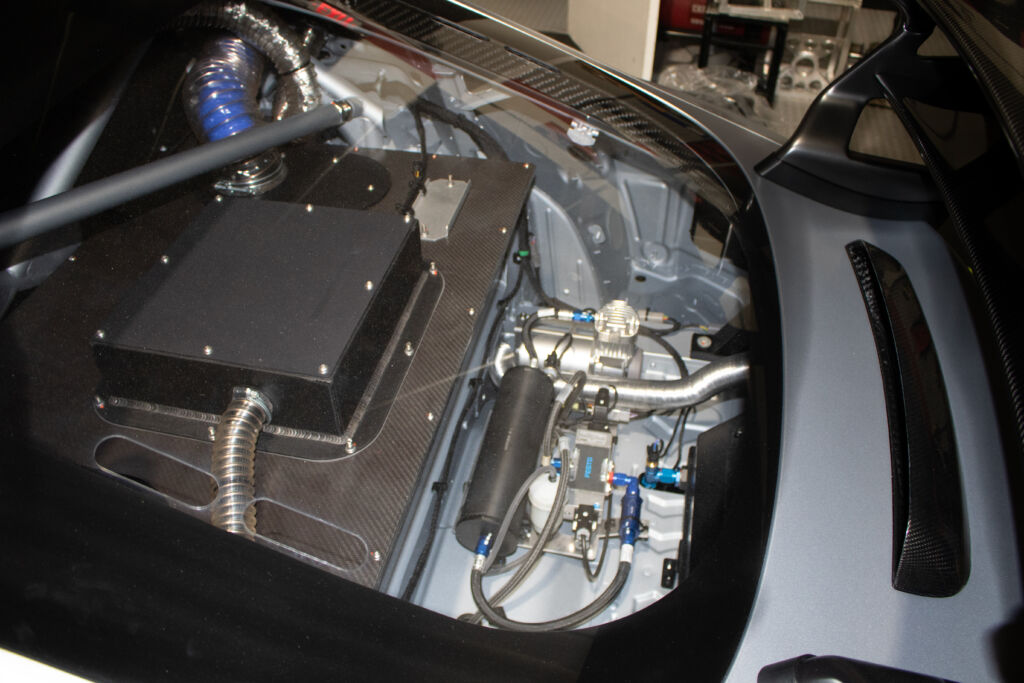 Track-Ready Specs: The power is transmitted to the rear wheels via a sequential Hewland 6-speed racing transaxle, accompanied by an adjustable racing differential for optimal control on the track. The four-way adjustable Bilstein dampers allow fine-tuning for high and low-speed rebound and compression. The car sits on 18-inch wheels, chosen for their compatibility with racing tires, and motorsport-grade steel brakes with adjustable brake balance ensure superior stopping power. The vehicle also features a 12-mode racing traction control and ABS system for precise handling.