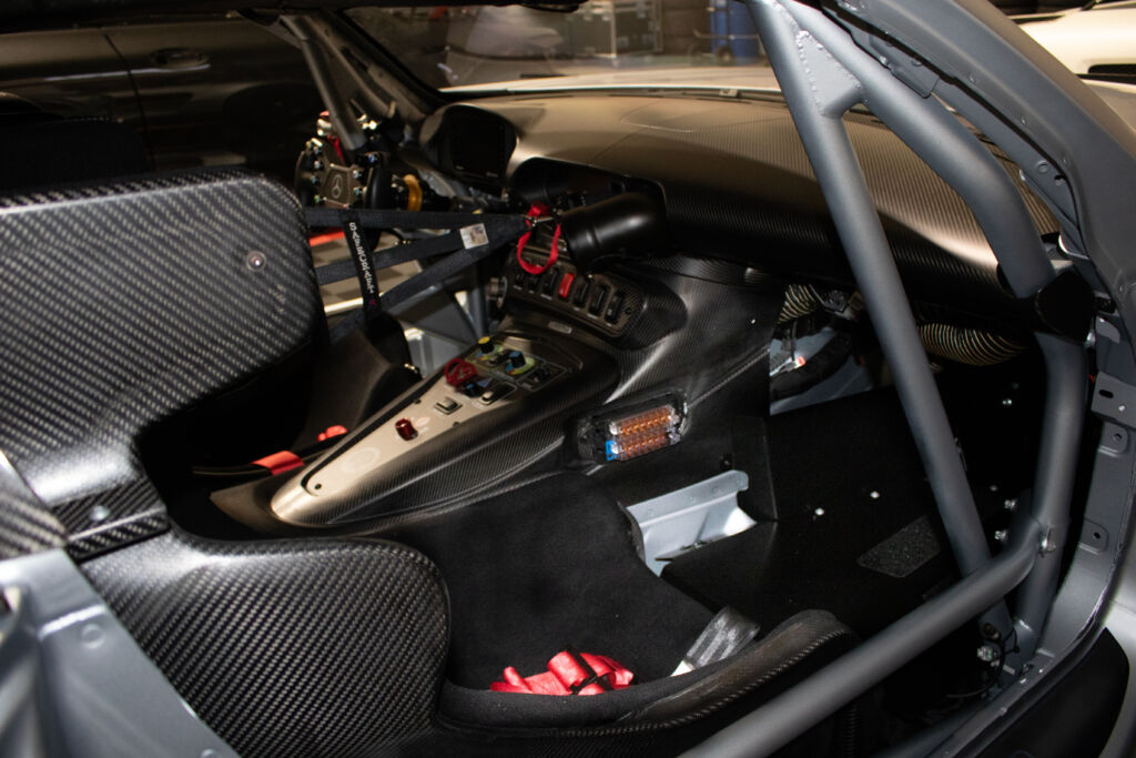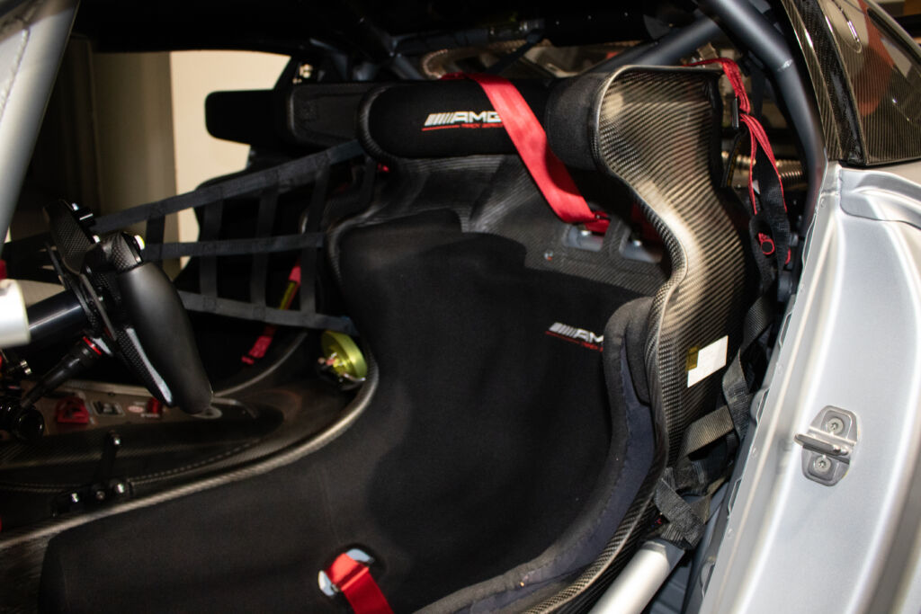 Aerodynamics and Safety: Upgraded aerodynamics from the Black Series include a higher downforce front splitter and a redesigned rear wing. Extensive use of carbon fiber in the Hightech Silver Magno bodywork reduces weight to just 3,086 lbs. Despite its lightweight design, the car is equipped with motorsport safety features, including a roll cage, fire suppression system, and roof extrication hatch, ensuring it meets the latest FIA safety standards.