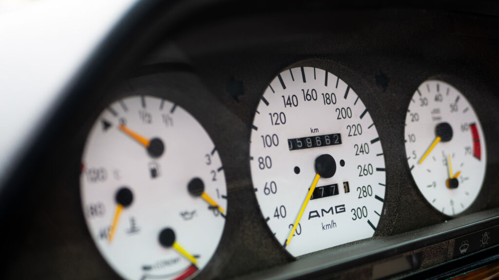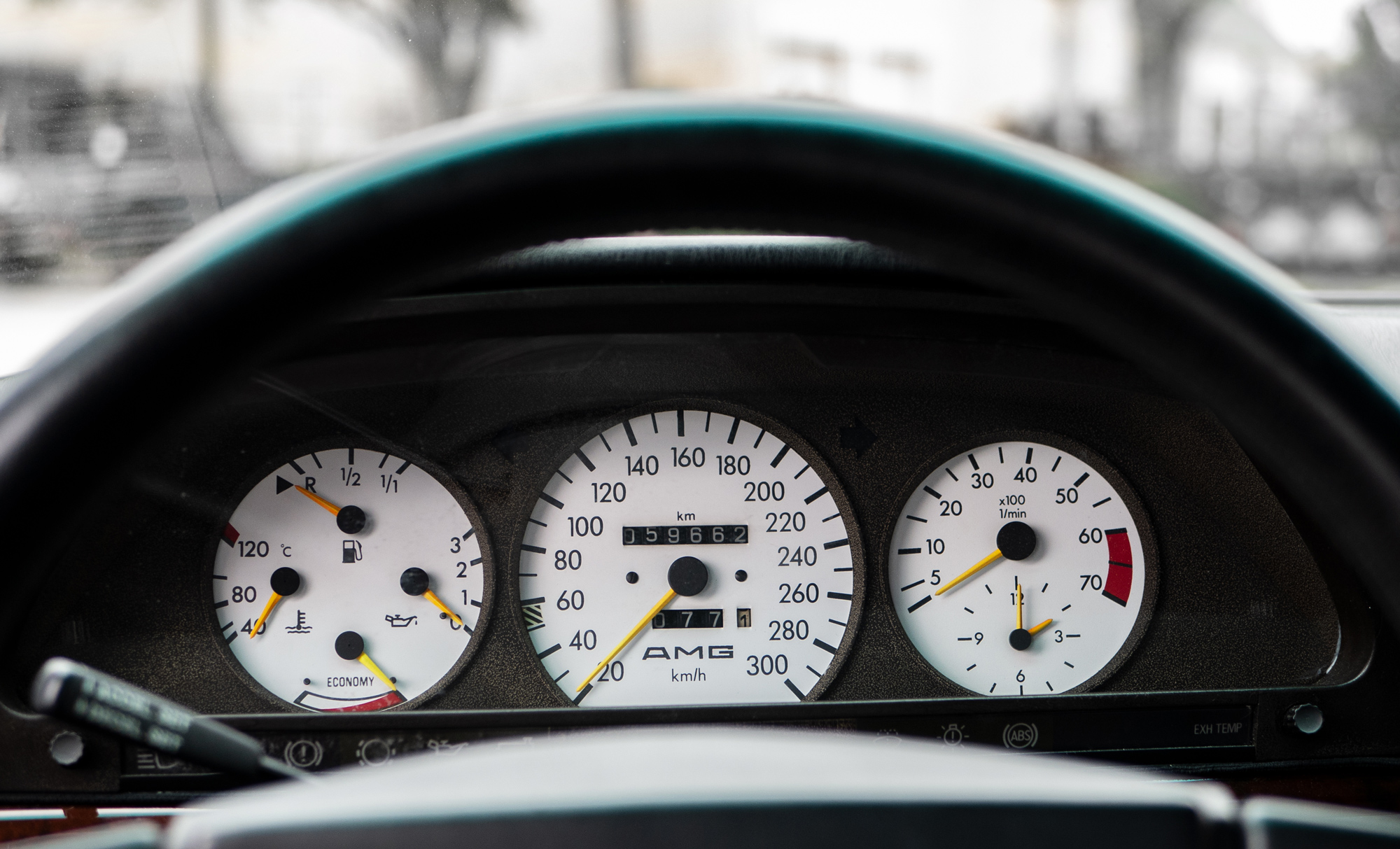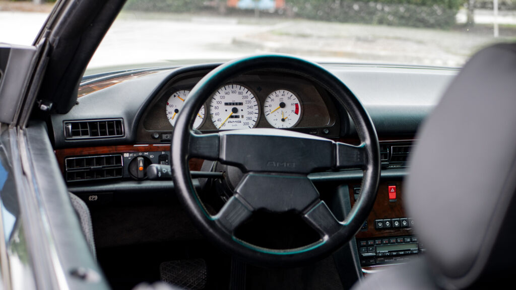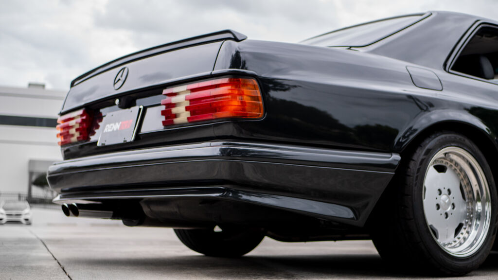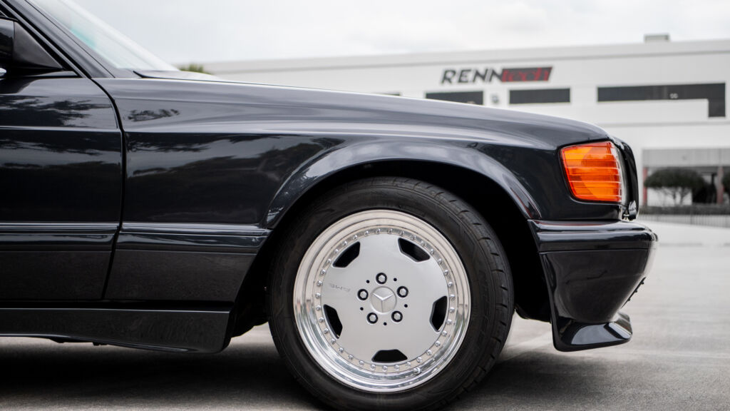 A complete frame-up restoration and engine repower was carried out at RENNtech. Every detail of this 560 SEC reflects the full AMG treatment—featuring an upgraded engine, enhanced suspension, wider wheels, AMG-specific gauges, and custom body panels designed to accommodate the broader suspension track.